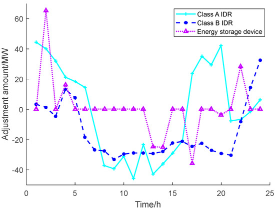 As a flexible peak shaving resource, virtual energy storage is capable of fast responses that can smooth the load curve. Joint peak shaving with CCPP units can significantly improve the peak shaving capability of the system. In the intraday phase, virtual energy storage can dispatch various resources. The result is shown in Figure 6. It can be seen that the response results of the Class A and Class B IDRs in the intraday dispatching process are similar. In the early morning (0:00–2:00), when the load is low and wind power is high, the two types of IDRs increase demand to promote the consumption of new energy. During peak periods, the output of wind power is small. Lowering the demand for the two types of IDRs can play a role in peak shaving, which can alleviate the peak shaving pressure of thermal power units (conventional and carbon capture). The response characteristics of actual energy storage devices are similar to those of IDR resources, charging during low load periods and discharging during peak load periods; however, due to limitations in energy storage capacity and charging and discharging costs, actual energy storage only works during the net load peak and valley stages. From the above analysis, it can be seen that the adjustment flexibility characteristics of virtual energy storage devices can effectively alleviate the peak load pressure of thermal power units and improve the reliability of power supply in power systems.