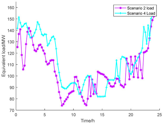 As can be seen from the table above, the changing trends of various costs in the intraday scheduling stage are similar to those in the day-ahead stage, so they will not be described again. Compared with the previous day, the wind curtailment costs of each scenario during the day have been significantly reduced, especially under Scenario 4, in which the full consumption of wind power was achieved, which illustrates the rationality of the unit start-up and shutdown plan in the current stage. The wind curtailment problem occurs in Scenarios 1–3, but the cost of wind curtailment is much less than that in the day-ahead dispatch stage, and the wind curtailment time is mostly concentrated in periods of high wind power generation and low loads.