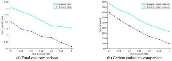 In the day-ahead and intra-day stages, the value of the flue gas split ratio can significantly affect the optimization results. This paper takes the day-ahead dispatching stage as an example to study the changes in the total system cost and carbon emissions under different flue gas split ratios. Figure 8 below shows the changes in total costs and carbon emissions in Scenarios 2 and 4 under different flue gas split ratio values.