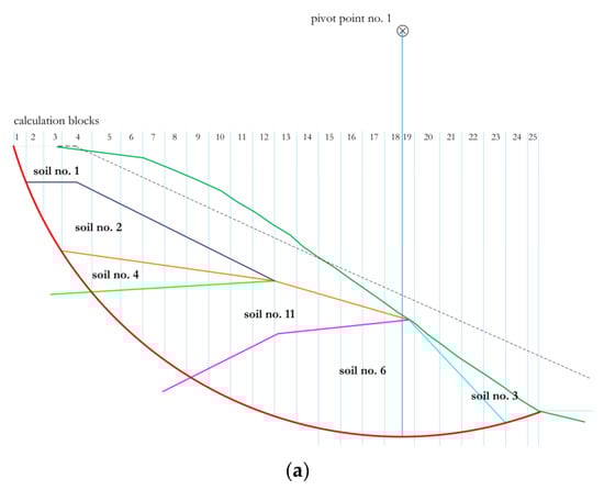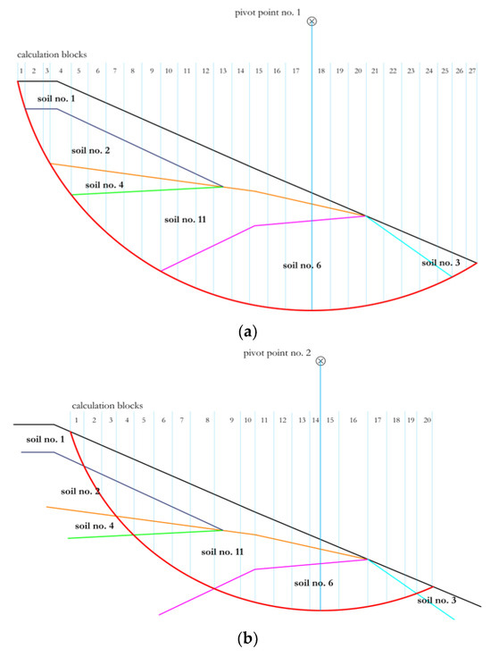 In the next design approach, the cross-section, marked in Figure 3 with the orange line, was adopted. The course of this cross-section was assumed to reach the area of the slope with the greatest inclination. The slope stability factor was determined for two positions of the pivot point. The first of them (Figure 6a) was adopted using the slope geometry according to the Fellenius method; in the case of the second point (Figure 6b), the “strong” layer of soil no. 6 was excluded. The schemes of the slope slip surface divided into calculation slices are presented in Figure 6.