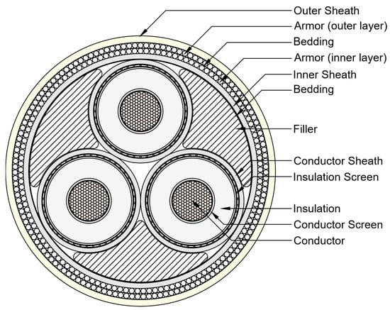 The present study provides three dynamic power cable models rated at 33 kV, 66 kV, and 132 kV. The cross-sectional view of power cable design is shown in Figure 1 and is standard for all three models. The only difference between the three models is the dimensioning of individual layers. Detailed dimensions for all three variants are given in Table 1 and Figure 2. The power cable consists of three conductor units. Each conductor unit has a nominal copper cross-section area of 630 mm2. The conductor is enclosed by a copper screen tied to the insulation layer made of cross-linked polyethylene (XLPE). XLPE insulation is preferred due to its favorable dielectric properties and high temperature resistance. Furthermore, XLPE has very good chemical and water resistance and provides very good protection against environmental degradation. Additionally, XLPE mechanical strength and low dielectric loss make it a durable and energy-efficient choice for insulation in dynamic power cable applications. The conductors are helically wound along the cable’s longitudinal axis and are separated by three filler bodies made of medium-density polyethylene (MDPE) to maintain the cable’s cross-section shape. The whole bundle is encapsulated in the inner sheath made of MDPE. The cable is protected by two cross-wound armor layers comprised of helically wound galvanized steel wires. The twist directions of the two layers are opposite to ensure the torsional balance of the cable. The 33 kV and 66 kV models use armor wire with a 3.15 mm diameter, and the 132 kV model uses armor wire with a 4.0 mm diameter. The armor layers are separated by thin bedding layers made of Polypyrrole.