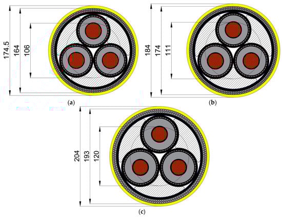 Outer diameter, armor diameter, and conductor diameter for (a) 33 kV, (b) 66 kV, and (c) 132 kV cable cross sections. Dimensions given in mm.