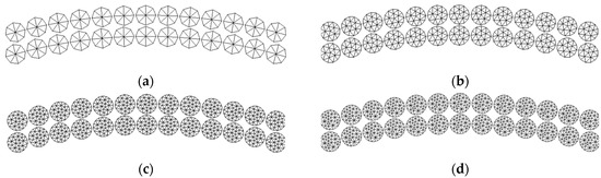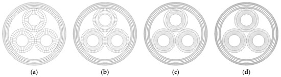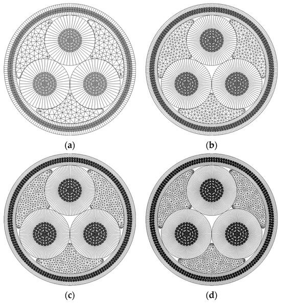 A mesh sensitivity study is an essential first step in FEM analysis. Its primary goal is to find the optimal mesh size that balances the computational efficiency with the accuracy of results. The present mesh sensitivity study involves both a global mesh density sensitivity study and an investigation of the effects of mesh refinement for the individual layers of the cable. The 66 kV cable model was selected for the mesh sensitivity study. It is assumed that the other cable variants are geometrically similar and have dimensions close enough to the 66 kV variant to generalize the results of the mesh convergence studies to 33 kV and 132 kV models. In the base case (Figure 4b), the conductor insulation and sheath layers are discretized with 48 shell elements and the cable bedding and outer sheath with 200 shell elements. Armor wires and conductor wires are discretized with 8 triangular beam elements. Triangular beam elements are used to model the filled bodies by dividing the circumference of the filler section into 44 segments. The other mesh variants, shown in Figure 5, are created using a constant mesh refinement factor. The summary of mesh parameters of the considered mesh variants is presented in Table 4.