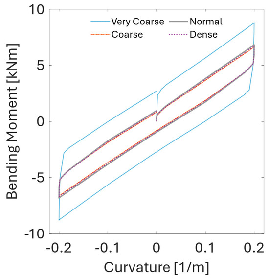 Hysteretic behavior of curvature-bending moment for cases with different global mesh densities.