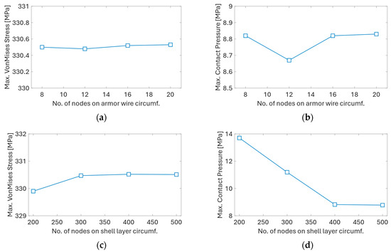 Mesh sensitivity study results: (a) effect of armor wire discretization on max. Von Mises stress; (b) effect of armor wire discretization on max. contact pressure; (c) effect of shell layers discretization on max. Von Mises stress; (d) effect of shell layers discretization on max. contact pressure.