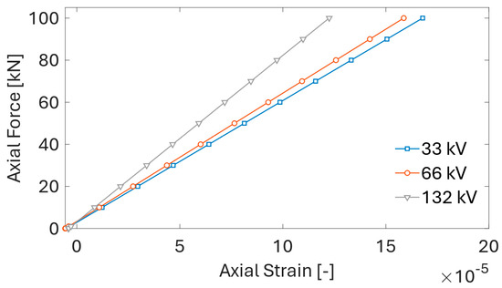 Mechanical properties of the three cable variants are obtained from a series of UFLEX simulations with different boundary conditions. The axial force–axial strain relation is obtained by gradually increasing the axial force and recording the axial deformation of a unit length of the cable. The obtained relations for all three power cable variants are shown in Figure 10. In all three cases, a linear relation is found with a constant slope corresponding to the axial stiffness, EA, of the cable: 622 MN for the 33 kV cable, 658 MN for the 66 kV cable, and 846 MN for the 132 kV cable variant.