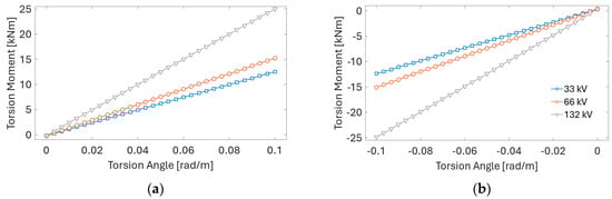 The three cable models’ torsional properties are obtained by gradually increasing rotation to a unit length of the cable and recording the resultant torsion moment. As shown in Figure 11, the torsion moment varies linearly with the applied torsion angle. The torsional stiffness, GJ, equals the slope of the corresponding line in Figure 11: 125 kNm2 for the 33 kV cable, 152 kNm2 for the 66 kV cable, and 250 kNm2 for the 132 kV cable variant. The bending moment–curvature relation is obtained by gradually loading the cable to a target tension level and subsequently subjecting it to gradually increasing curvature. As shown in Figure 12, the relation between the bending moment and curvature is not linear anymore and shows approximately a bi-linear relation.