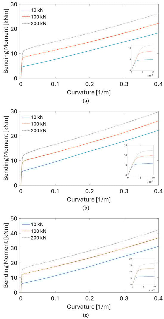 Bending moment–curvature relationships for three cable variants obtained from UFLEX simulations at different tension levels: (a) 33 kV, (b) 66 kV, (c) 132 kV cable model.