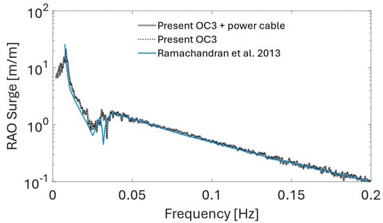 Surge RAO comparison for the considered OC3 FOWT setup without and with 66 kV power cable in a lazy wave configuration. Validation against FAST simulation results by Ramachandran et al. [55].