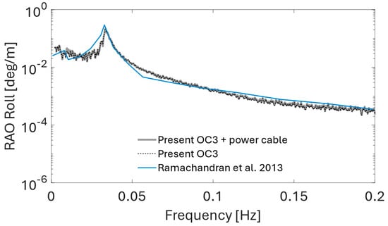 Roll RAO comparison for the considered OC3 FOWT setup without and with 66 kV power cable in a lazy wave configuration. Validation against FAST simulation results by Ramachandran et al. [55].