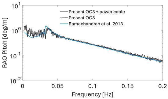 Pitch RAO comparison for the considered OC3 FOWT setup without and with 66 kV power cable in a lazy wave configuration. Validation against FAST simulation by Ramachandran et al. [55].