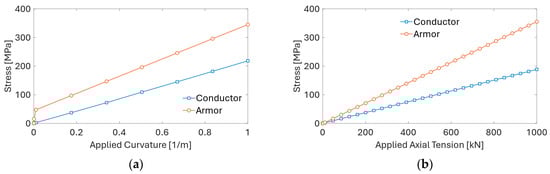 Stress factors for conductor and armor wires obtained from UFLEX simulations: (a) stress versus applied curvature; (b) stress versus applied tension.