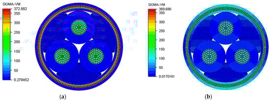 Von Mises stress distribution in the cable cross-section under (a) axial load of 1000 kN, (b) bending curvature of 1 rad/m.