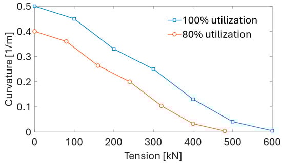 By considering additional cases of combined tension and curvature load, the capacity curve of the cable is obtained, as shown in Figure 21. The 100% utilization limit is applicable for the installation phase and the Accidental Limit State (ALS). For the extreme loading condition, the 80% utilization curve is applicable for an Ultimate Limit State (ULS). The Minimum Bending Radius (MBR) is defined as the reciprocal of the curvature limit at zero tension on the 100% utilization curve. Conversely, the Maximum Handling Tension (MHT) is defined as the tension limit at zero bending.