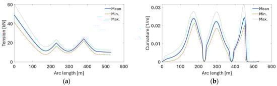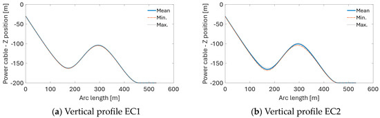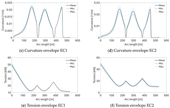 Envelopes of the cable’s vertical profile, curvature, and effective tension for EC1 and EC2.