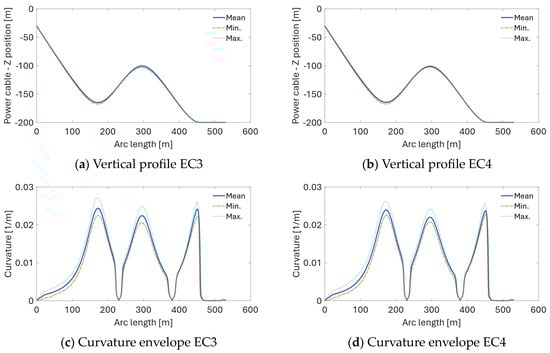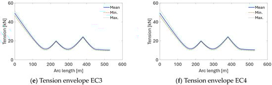 Envelopes of the cable’s vertical profile, curvature, and effective tension for EC3 and EC4.