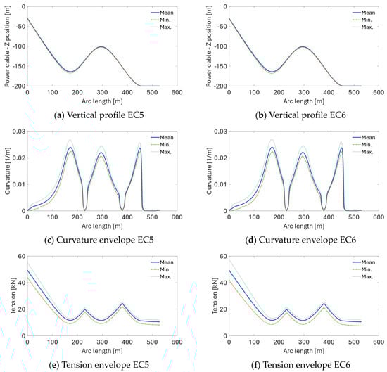Envelopes of the cable’s vertical profile, curvature, and effective tension for EC5 and EC6.