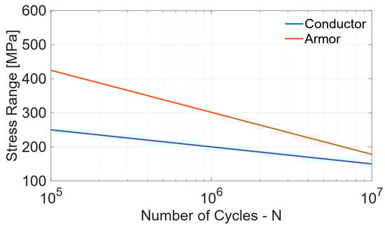 where is stress; and are the tension and curvature stress factors, respectively; is the effective tension; and are the components of curvature in the cable’s local x and y directions; and is the circumferential location of the fatigue point. The stress factors (Figure 20) computed using the local UFLEX model of the cable cross-section are used as an input to OrcaFlex. Due to the tensile properties of ETP copper and creep effects, the use of the S-N curve (stress cycle) approach to predict fatigue life has several shortcomings. As pointed out by Karlsen [56], the plastic straining of the conductor has a significant impact on the fatigue life estimation accuracy. Therefore, it is recommended to use the ε-N (strain versus number of cycles to failure) curves in the fatigue analysis of the copper conductors.