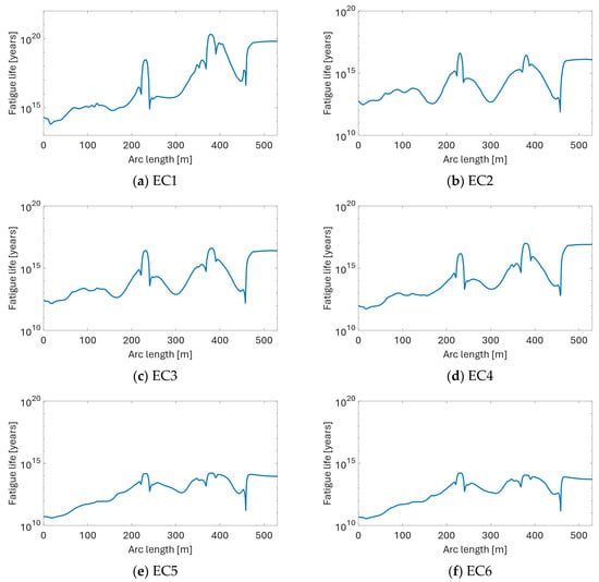 The Rainflow counting method is applied to determine the stress cycles, and the Miner–Palmgren rule is used to calculate the accumulated damage. Figure 28 presents the calculated fatigue life along the cable length. The overall fatigue life is very high due to the relatively small amplitude of cable motions and curvature fluctuations, as presented in the dynamic response analysis part. Another reason is that frictional stress is ignored in the present OrcaFlex stress model. A more advanced algorithm would be required to consider this effect. Nevertheless, there is an observable trend of decreasing fatigue life with increasing wind speed, wave height, and current speed (e.g., from EC1 through EC6).