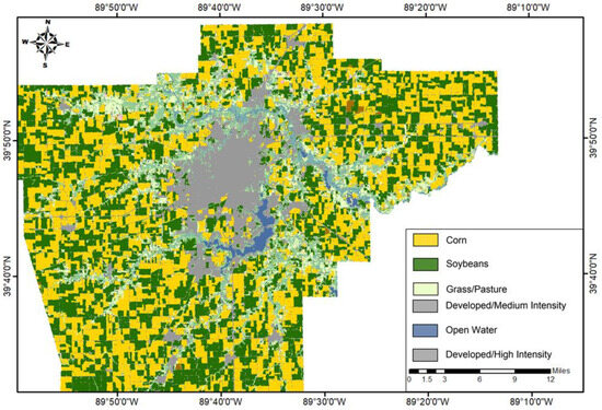 Crop data for Sangamon County were obtained using the Crop-Scape-Crops Dataset Layer (CDL) database, which was created in collaboration with USDA’s National Agricultural Statistical Services (Figure 2). This database includes high-resolution 30 m satellite imagery that covers a period of over twenty-five years (1997–2022) and provides extensive information on agricultural land use and aerial applications (https://nassgeodata.gmu.edu/CropScape/, accessed on 4 January 2024). The data from this database were used to calculate the quantity of organophosphate pesticides used, which was obtained by multiplying the crop cultivation area by the average pesticide rate of 2.40 kg per acre [71,72].