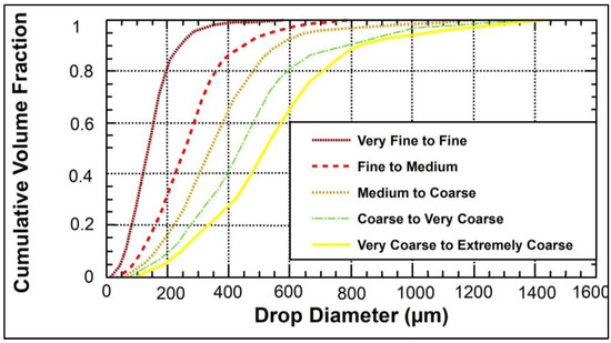 AgDRIFT categorizes drop sizes into six modes, namely Very Fine, Fine, Medium, Coarse, Very Coarse, and Extremely Coarse. Figure 3 illustrates the ASAE reference threshold curves for drop diameters measured in micrometers (μm) against cumulative volume fraction. These curves establish the thresholds that distinguish between reference atomization regimes.