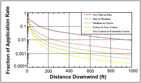 The AgDRIFT model has undergone extensive validation through 360 separate ground-boom and aerial treatments. Furthermore, more than 3000 wind tunnel atomization tests have been conducted, using a wide variety of nozzles at different wind speeds and nozzle angles relative to the wind field. These tests were carried out with many different types of chemical and physical characteristics for materials sprayed during SDTF field trials. This rigorous testing ensures the reliability and accuracy of the AgDRIFT model [87]. The AgDRIFT model was used to calculate the rate of spray drift from various pesticide treatments, taking into account factors such as spray nozzle droplet dispersion, high sprayer boom, and wind speed (which varied between 4 and 10 miles per hour). According to ASAE Standard S572, downwind drift decreases as droplet size increases [40]. When choosing their application-specific equipment, pesticide applicators in the United States often consider the volume median diameter (Dv0.5) and the spray volume in droplets that are less than 100 m (V < 100 m) and 200 m (V < 200 m). The V < 200 m represents the spray that is most susceptible to drift, while V < 100 m represents the percentage of spray that is likely to travel more than 1 km. Table 5 shows the droplet spectra of a reference nozzle that is categorized as medium, which has a Dv0.5 of 294 m, V < 100 m of 5%, and V < 200 m of 25%. In contrast, a fine droplet spectrum has a Dv0.5 of 180 m, V < 100 m of 20%, and V < 200 m of 60% [40,85,86,87]. In Illinois, the use of fine droplet spectra is considered inappropriate for pesticide applications due to the potential for drift. Therefore, this study assesses the potential hazards of medium and coarse spray drift to unintended targets within a 1 km radius of the application position.