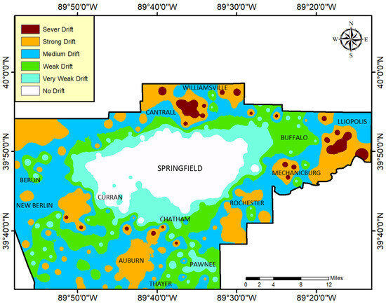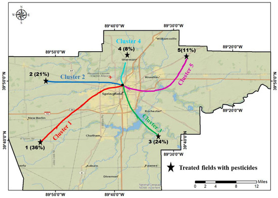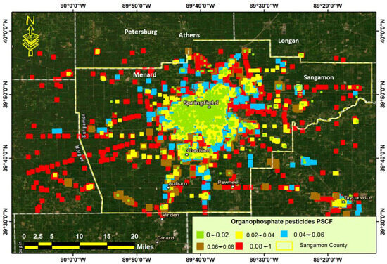 Large-scale studies focusing on the environment and health require precise measurements of pesticide exposure near crops. In previous studies, the Spraying Drifting Task Force (SDTF) regular standards were used to determine the potential risks of being exposed to pesticide drift [59,60,61]. However, the lack of an agricultural pesticide database has made it necessary to rely on comparing pesticide usage distribution with maps. To explore the impact of pesticide drift on the environment and community well-being, especially in counties that lack pesticide usage records, previous studies have used GIS and satellite imagery. Their approach and findings will be more relevant and useful at a county-wide level, such as in Sangamon County [57,58,59,60,61,62,63].