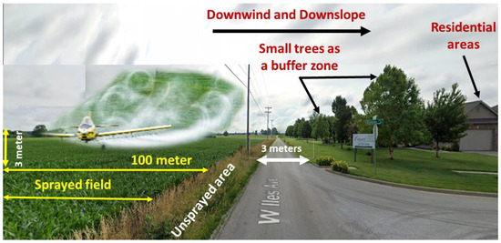 The study’s approach is based on the assumption that the primary cause of air pollution affecting urban–rural interface residents is the drift of pesticides from their intended targets, rather than industrial activities that emit pollutants into the air. This assumption is supported by evidence showing that over 60% of the nearly 600 complaints received by the Illinois Department of Agriculture in 2019 were related to pesticide drift (https://agr.illinois.gov/pesticides/pesticides-uses-misuses.html, accessed on 24 December 2023) and that the amount and potential for drift of organophosphate pesticides are comparable.