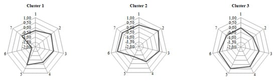 In Figure 1, radar graphs are presented, illustrating the differences between each cluster. For its construction, the demographic characteristics of the respondents were considered (Table 7).