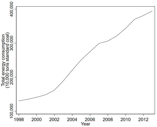 Sustainable development has aroused wide concern, both public and academic. Concerning the progression of industrialization, many Western countries have adopted the “pollute first, control later” strategy, which sacrifices the interests of the next generation and goes against the original intentions of sustainable development. For the excessive pursuit of economic interests, many countries tend to abuse resources and release enormous amounts of pollutants, which have inflicted substantial strain on the environment. The resulting environmental problems not only slow down economic development [1] but also cause huge damage to human health [2,3,4]. This type of development model cannot be perpetuated. Moreover, with its opening up and reform strategy, China has achieved substantial economic development. Meanwhile, extensive development aggravates the consumption of energy resources (as shown in Figure 1) and produces substantial amounts of pollution [5,6,7]. This development pattern of “high-energy consumption, high-polluting, and high-emission” is no longer desirable [8]. How sustainable development can be achieved is, therefore, an urgent issue, especially for developing countries like China. In such a scenario, the Chinese government has implemented a variety of policy tools to retain the balance of economic development and environmental protection [9]. Among these measures, the pollution levy is one crucial step towards sustainable development.