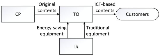 Subscribers of telecom operators search and buy apps or contents through fixed or mobile broadband Internet connections, and accordingly, telecom operators purchase service capabilities from infrastructure suppliers on the basis of their user scale. Thus, the telecom service supply chain is actually made up of a content service supply chain and an infrastructure supply chain. With the advent of the Industry 4.0 era and the development of next-generation mobile communications and mobile networks, the service capabilities of telecom operators are also constantly expanding [5,6]. In the content service supply chain, customer sensitivity to subscription prices is paramount. Content providers, such as news anchors or YouTube commentary hosts, often offer programs for free or at very low membership fees, relying on platform monetary rewards to sustain their livelihoods. Conversely, in the infrastructure supply chain, telecom operators typically offer similar communication service quality due to comparable technologies and coverage. To gain a competitive edge, leading telecom operators often differentiate themselves by embracing green practices, aiming to impress customers and earn goodwill as environmentally conscious service providers. In fact, telecom operators provide some fairly low-carbon ICT solutions, such as remote meeting, e-reading, music or video streaming, online payments, cloud computer, etc. And all kinds of these ICT solutions can be based on a low-carbon concept in marketing promotions. Thus, marketing and strategy departments believe that becoming a green operator will really help them sell more business. In contrast, construction and maintenance departments often hold the view that energy-saving investment usually takes at least 3–5 years to achieve financial balance and face many risks. In fact, it saves electricity but not money.