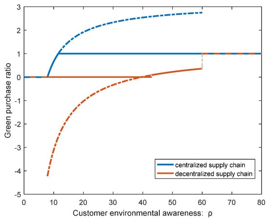 According to the analysis shown above, the optimal decisions of both sub-supply chains are illustrated as Equations (6) and (13). By plugging Equation (6) into Equation (13), the optimal green purchase ratio can be calculated as Equation (18), when 0 < < 1. Subscript denotes this final integration case.