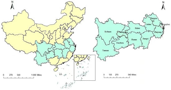 The Yangtze River Economic Belt, as one of the three important supporting belts in China, accounts for 21.4% of the country’s total area, covering 11 provinces and regions across the three major sectors of east, central, and west (see Figure 1). In 2022, its economic aggregate accounted for 46.5% of the country’s total weight, making it a key battleground and economic center for ecological priority and green development. However, the long-term rough development mode has made the city’s ecological carrying capacity insufficient, facing problems such as a lack of resources, pollution of the environment, ecological devastation, and an unbalanced industrial layout, resulting in a lower overall ecological resilience and a trend of degradation of ecosystem service functions. According to The Annual Report on the Development of the Yangtze River Economic Belt (2019–2020) statistics, the Yangtze River Economic Belt emissions of sulfur dioxide, nitrogen oxides, soot, and dust accounted for 40% more than the national total and the relative inadequacy of the disposal of solid waste pollution, and in 2020, the direct economic losses due to flood disasters exceeded 200 billion yuan [1]. As a result, the ecological and environmental risks are prominent. As an important cluster of high-pollution industries such as heavy chemicals, electronic messages, and equipment manufacturing in China, there is a huge space for industrial innovation synergy and ecological civilization construction in the Yangtze River Economic Belt.