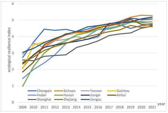 - From the perspective of the time dimension, the level of ecological resilience of the Yangtze River Economic Belt from 2009 to 2021 shows a fluctuating upward trend in general, with some oscillations in a few years. From 2011 to 2018, the index first decreased and then increased, i.e., there was a “U-shaped trend”, in which the consumption rate of resources by human activities was faster than the regeneration capacity of resources, leading to a decrease in the carrying capacity of the ecological environment. Under the conditions of rapid economic development and the continuous optimization of industrial structure, people have put forward higher requirements for green development and an ecological environment. With the improvement of the green finance system and strong support from national finance, the level of ecological resilience of all the provinces reached the highest point in 2019 and crossed the inflection point of the environmental Kuznets curve downward, and the rate of increase leveled off after 2020. The ecological environmental quality has been improved and strengthened and the adaptive capacity to cope with uncertain risks has been strengthened.
