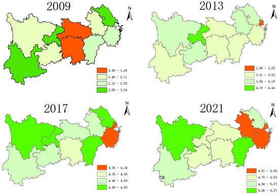 Social and ecological systems have complexity and vulnerability and will continue to be impacted and disturbed by internal and external environmental risks. Therefore, it is an important issue in the current era to grasp the law of ecological development and establish a harmonious relationship of equality and coexistence between man and nature [41], so as to satisfy the people’s growing needs for green development and a good ecological environment. Based on this, this paper selects a total of 12 indicators to measure the ecological resilience level of 11 provinces and cities along the Yangtze River Economic Belt from the three dimensions of “resistance-adaptability-resilience”, deeply considering both sides of the ecological elements to synergize with the ecological security and service demand, as shown in Figure 2. At the same time, the ecological resilience level of the study area in four key years, 2009, 2013, 2017, and 2021, is mapped using Arc GIS with provincial units as the boundary, and the spatial visualization further supports the promotion of green finance on ecological resilience. Figure 3 shows the dynamic evolution of time and space of the ecological resilience level of the study area.