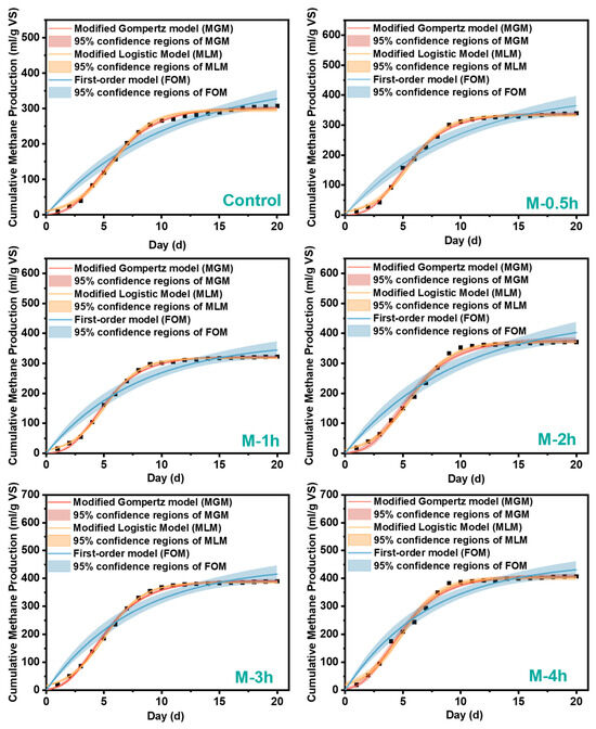 Figure 2 displays the fitting curves for the cumulative methane production of the three kinetic models. The relevant kinetic parameters can be found in Table 1. In general, both MGM and MLM were well-suited for the AD process. The R-squared values for all groups exceeded 0.99 (0.994–0.999), and the root mean square error (RMSE) was below 15. Nevertheless, FOM considers the entire gas generation as a single reaction, which is inadequately suited for all groups save the control group. The RMSE values for all groups were significantly high (>25). Furthermore, the 95% confidence intervals also show an upward trend as the AD proceeds. Based on the observation that the simulation curves closely matched the experimental data, it can be concluded that both MGM and MLM were capable of reliably forecasting production at each stage. Nevertheless, the MLM model exhibited an initial methane output that was higher than 0, while maintaining the accuracy of the fit. This suggested that the MLM model forecasted a longer digestion time than MGM with accuracy. MGM outperformed MLM in accurately forecasting CMP during the initial 5 days. MGM reaches its maximum gas output plateau earlier than the MLM model, following the exponential development phase. Regarding maximal methane production and model accuracy, MGM achieves superior R2 and lower RMSE values, with the exception of the M-2h and M-3h groups. Table S2 displayed the anticipated values and experimental values of the three models, along with the absolute values of the error percentages for each group. MLM consistently underestimates the predicted Pm values, while MGM shows smaller errors compared to the experimental values. This was consistent with previous research findings [24,25]. Thus, MGM was more suitable for the AD process of FW with a short milling time (0–1 h), while MLM demonstrated more accurate fitting for a long time (2–4 h).