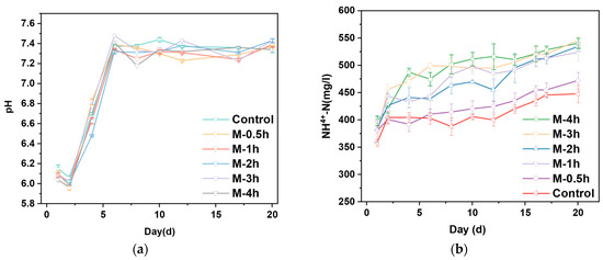 Although ammonia is essential for bacteria, it can act as an inhibitor when concentrations are at high levels (1.7–14 g/L), which might hinder the activities of related enzymes and microbial metabolism [31]. Figure 3b demonstrates the variation of NH4+-N concentration during the AD process. The NH4+-N concentration in all reactors ranged from 358.04 to 545.49 mg/L, which increased dramatically with the milling time increasing. Milling groups increased rapidly to higher levels compared to the control group in the first four days due to the accelerated rate of hydrolysis. The NH4+-N concentration in the M-4h group on day 5 was 1.3 times higher than that in the control group. The results above demonstrated that NH4+-N had little inhibitory effect on the AD systems in this research.
