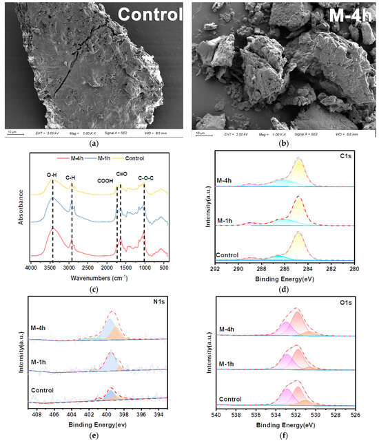 Figure 4 exhibited the SEM images (a,b), FTIR (c), and XPS (d–f) spectra of the original and UFWM pretreatment FW. In Figure 4a,b, the unpretreated particles all had smooth and dense surfaces. After UFWM pretreatment, the large particles were crushed into small particles due to impact, shear, and other interactions, which showed a scale-like surface. Simultaneously, the large number of voids and pores left by the milling provided an easily accessible area for hydrolyzing enzymes.