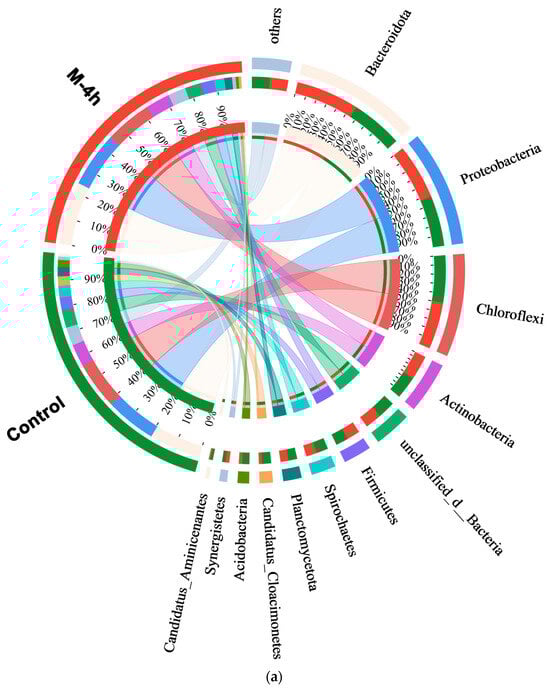 Variation of bacterial communities at phylum level (a); and archaea community at genus level (b) of control and M-4h group.