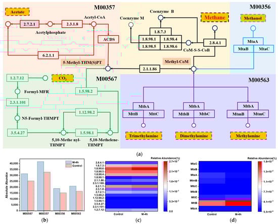 Four main methanogenic pathways of map: 00680 based on KEGG (a); absolute abundance of four modules in map00680 (b); relative abundance of key enzymes; (c) and functional genes (d) in four modules.