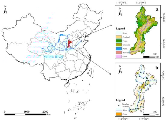 Overview of the study area: (a) land use types in the Fen River Basin; (b) distribution of corn crops and meteorological stations in the Fen River Basin.