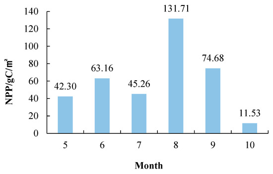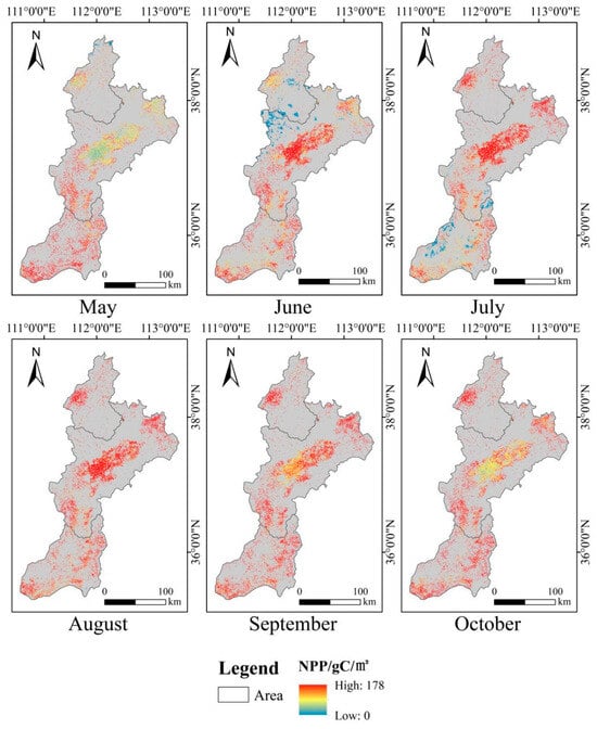 Using the CASA model and the mean value approach, this study simulated the corn NPP in the Fen River Basin from May to October. Subsequently, an analysis was conducted to examine temporal trends (Figure 2) and spatial distribution patterns (Figure 3).