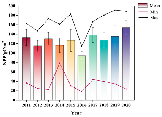 In Figure 4, the temporal changes were analyzed, revealing that the mean August corn NPP in the Fen River Basin fluctuated between 94.23 gC/m2 and 154.12 gC/m2 during the period from 2011 to 2020. Overall, there was an upward trend in NPP, marked by more significant fluctuations between 2011 and 2016 and, particularly, a pronounced decline from 2015 to 2016. Conversely, a relatively smooth upward trend was observed from 2016 to 2020. This observed pattern could be attributed to factors such as the arid climate and abundant precipitation in the Fen River Basin. Furthermore, when considering the maximum and minimum NPP values, fluctuations in corn NPP during August were similar from 2011 to 2017. However, after 2017, the maximum NPP value steadily increased, whereas the minimum NPP value showed a consistent decline. In conclusion, the carbon sequestration capacity of corn crops in the Fen River Basin demonstrated a continuously increasing trend from 2011 to 2020, particularly after 2017. This was evident in the rising mean and maximum NPP values and the declining minimum NPP value, indicating a clear improvement in carbon sequestration capacity.