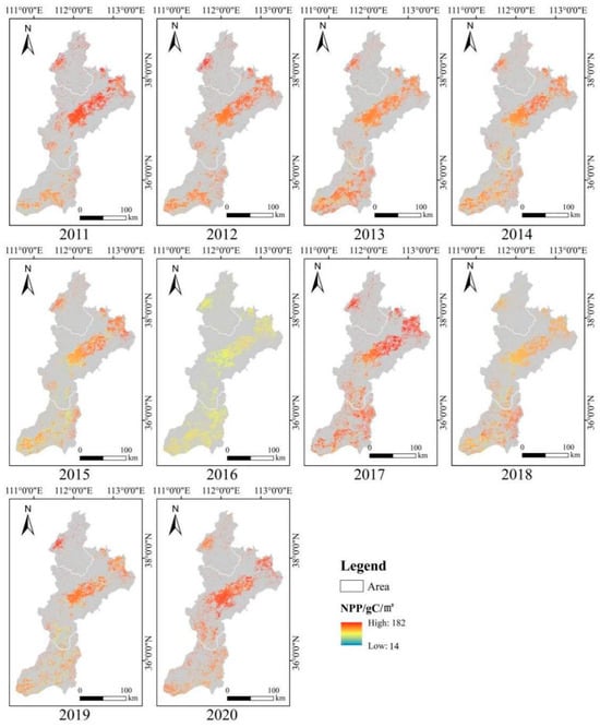 A previous study revealed that corn NPP reaches its peak in August, providing a more representative insight into annual corn NPP development. Consequently, this study investigated the temporal and spatial fluctuations in August corn NPP in the Fen River Basin between 2011 and 2020. The aim was to gain a comprehensive understanding of the long-term trends in corn NPP variation.