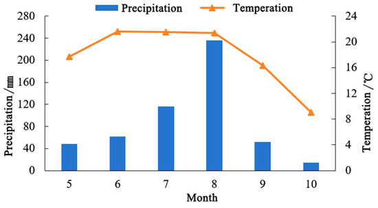 The Fen River Basin has a typical semi-arid continental monsoon climate. Figure 6 shows the temperature and precipitation patterns from May to October 2020. Both temperature and precipitation display distinct seasonal variations, forming a single-peaked curve characterized by an initial rise and subsequent decline. Precipitation demonstrated an ascending trend from May to August, with a notable surge in average precipitation during August, reaching its peak before a significant decline. The average monthly precipitation was as follows: May (48.48 mm), June (61.35 mm), July (116.31 mm), August (236.48 mm), September (51.52 mm), and October (14.21 mm). Regarding temperature, the average temperature increased from 17.74 °C in May to 21.60 °C in June and remained relatively stable around 21.50 °C from June to August. However, there was a notable decrease in the average temperature from 16.35 °C in September to 9.04 °C in October.