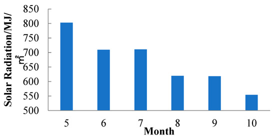 The temporal variation in solar radiation within the Fen River Basin from May to October 2020 exhibited a discernible stepwise decline (Figure 7). Solar radiation reached its peak in May at 802.69 MJ/m2. In June and July, there was minimal variation, with solar radiation levels consistently hovering at around 710 MJ/m2. August and September also displayed relatively stable values, although notably lower than those of the preceding months, maintaining an approximate value of 619 MJ/m2. Finally, the solar radiation reached its nadir in October, registering a mere 554.14 MJ/m2.