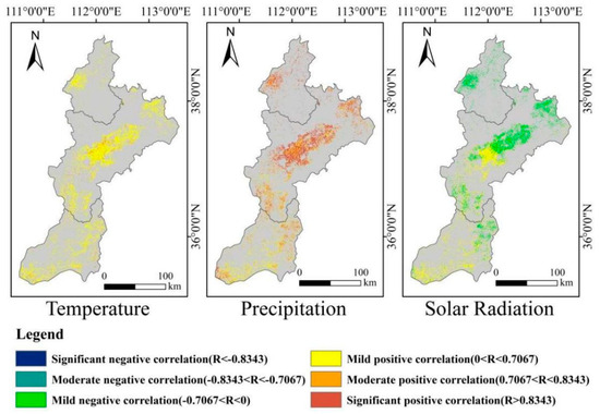 The geographical correlation coefficients between corn NPP and solar radiation ranged from −0.7860 to 0.8695. Overall, the spatial relationship between corn NPP and solar radiation in the Fen River Basin was primarily characterized by mild negative and mild positive correlations. Specifically, the most prevalent correlation was mildly negative, accounting for 50.80% of the data. This mild negative correlation was predominantly observed in the western and northeastern areas of the upper section, upper and middle regions of the middle section, southern and northeastern regions of the middle section, and eastern portion of the lower section of the Fen River Basin. Conversely, mild positive correlations accounted for 48.29% and were mainly concentrated in the middle and lower sections of the Fen River Basin, with the exception of certain areas in the eastern region. Moderate negative, moderate positive, and significant positive correlations were rare, comprising 0.54%, 0.34%, and 0.03%, respectively. These correlations were sporadically scattered across the western upper, central middle, and southern lower sections of the Fen River Basin.