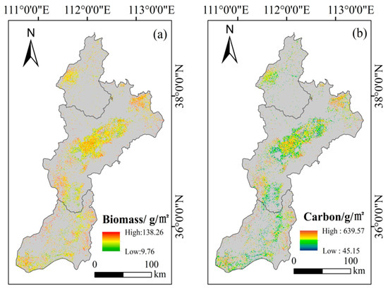 Equation (5) facilitates the conversion of cumulative corn NPP into aboveground biomass, provided that the root–crown ratio and carbon content parameters are available. The coefficient for converting NPP into carbon sequestration was derived from the chemical equation governing photosynthesis in the green plants. Consequently, corn carbon sequestration was estimated by applying Equations (6) and (7). The geographical distribution of the aboveground biomass of corn is depicted in Figure 9a,b and illustrates the patterns of carbon sequestration in the Fen River Basin for 2020.