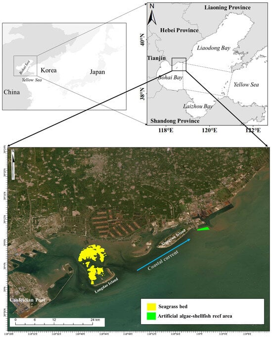 The Caofeidian shoal, formerly a part of the Luanhe River Delta, has undergone transformation into a barrier island–lagoon system as a result of wave and tidal erosion [30,31]. This lagoon experiences irregular semidiurnal mixed tides, with an average water depth ranging from 0 to 5 m and a tidal flat width spanning 15 to 25 km [32,33]. Within this system lies China’s largest eelgrass bed covering an area of 3217.32 ha. The foundation species Zostera marina exhibits a perennial life cycle (Figure 1) [34]. During late summer or early autumn, a substantial quantity of eelgrass leaves detach as part of the plant’s renewal process. These leaves are transported by winds and currents over approximately 30 km to reach the marine ranching area in Xiangyun Bay. The verified presence of floating seagrass northeast of the bed strongly supports the notion that seagrass is being transported towards the marine ranching area [35]. Consequently, some of these leaves settle within the ranching zone.