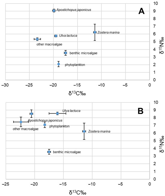 Stomach content analysis is a conventional method for meticulously examining diet composition and feeding ecology; however, its scope is limited as it solely portrays the short-term feeding status of organisms [18,19]. Fortunately, stable isotope analysis overcomes these limitations by offering a simplified sampling method and revealing the long-term feeding patterns of organisms through C and N isotope fractionation between predators and prey. This approach facilitates the identification of consumer nutritional sources, investigation of biotrophic interactions, and inference of biotrophic ecological niches [20,21]. Stable isotope analysis involving C and N has been extensively applied in various aquatic ecosystem studies [22,23,24,25], effectively exploring trophic connections among estuarine and marine habitats [26,27]. Previous studies suggest that detritivore consumers closer to the bottom of the food web, such as the sea cucumber A. japonicus, are more likely to assimilate plant debris rather than carnivorous fish [28,29]. For example, stable isotope analysis revealed that suspension-feeding bivalves (Dosinia spp.) in Whangapoua Estuary (New Zealand) assimilated seagrass and fringing vegetation detritus [27]. Building upon this precedent, our study employed stable isotope analysis fittingly to uncover trophic connections between seagrass beds and mariculture activities.